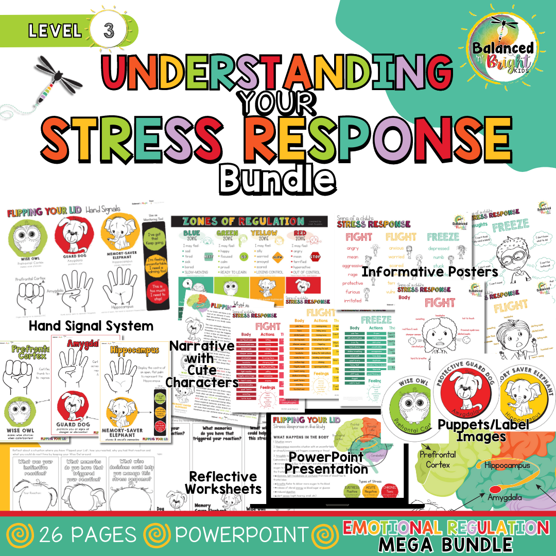 Our Signs of Stress Response outlines in visual diagrams emotions, actions/body signs and thoughts associated with the Fight, Flight & Freeze responses and also provides visual explanations of how stress effects the brain and body. Children will be able to identify the effects on their bodies, thoughts and actions for each type of responses and even which stress response they often default too personally. With this awareness, children will be able to recognise various signs of stress earlier on in the hope that they can choose calming strategies to defuse their stress or discomfort prior to ‘Flipping their Lid’.