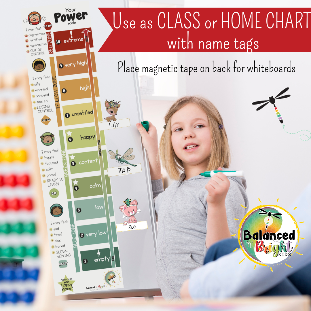 CHECK-IN FOLDER: Create individual check-in folders with resources glued into a manilla folder with either the desk version with (or without) explanations or a reduced horizontal or vertical Power Scale alongside the Self-care Power Tools. Allow the children to personalise their cover with different emotions or emojis. Check-In with these at various times throughout the day. Add strategies to their Power Tool kit as they find new strategies that work.