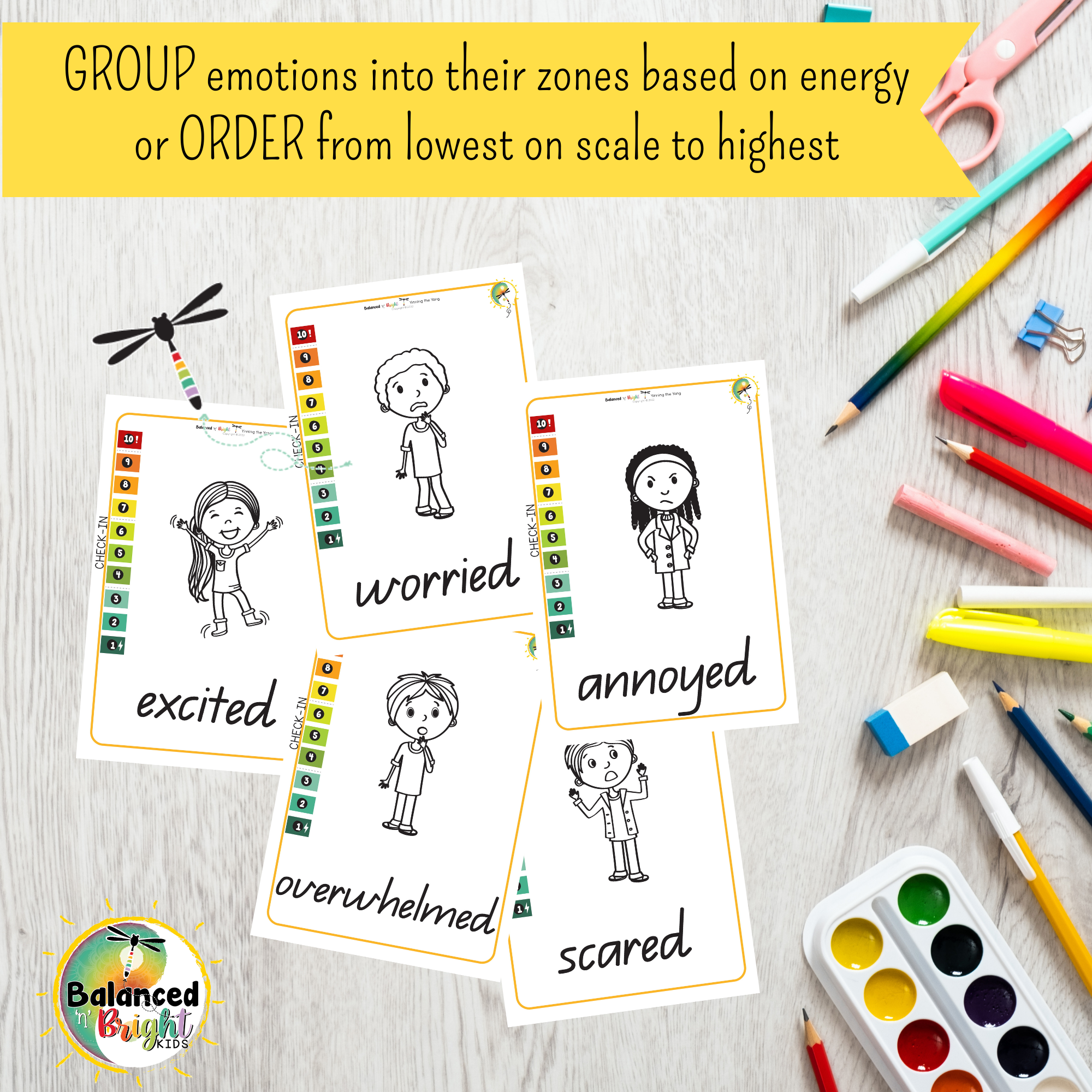 ♥ 42 colour-coded full-body Emotion Cards (& images) with 1-10 scale for check-in