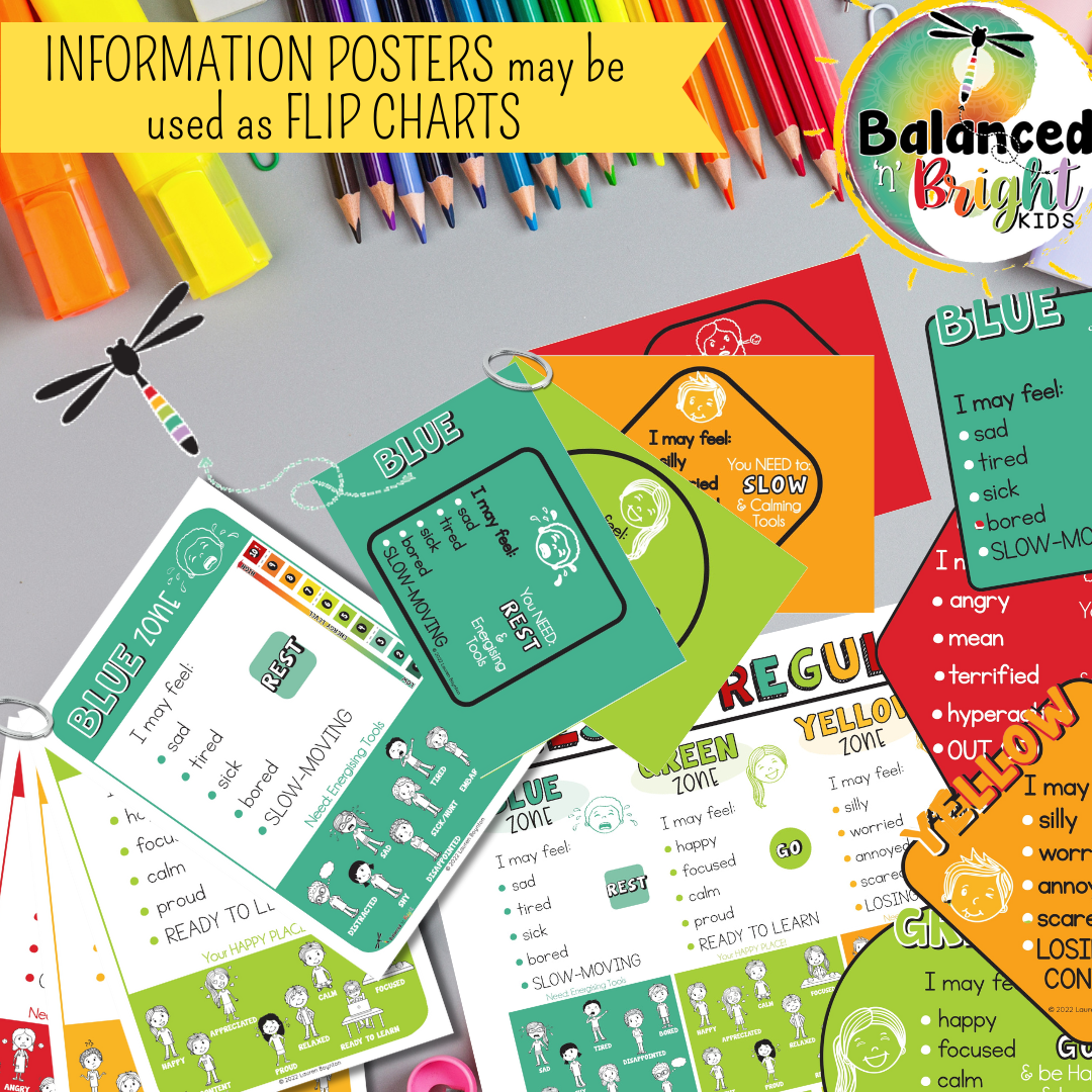 FLIP CHARTS: Laminate your choice of Zones information posters or cards, add a ring to the corner and make zone cards for the children to flip through to indicate their current zone for teacher or carers to see at a glance.